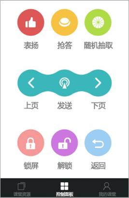 6、在控制面板界面,可对互动课堂进行控制:互动课件翻页、发送互动组件、发起抢答及随机抽取、进行表扬、锁屏/解锁。